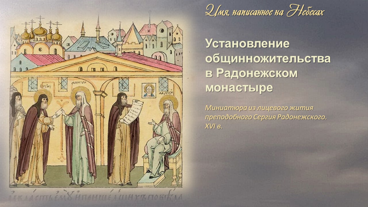 Со временем Преподобный увидел необходимость устройства общинножительства. Чтобы придать своему начинанию больше твёрдости и авторитета, Сергий, поддерживаемый митрополитом Алексием, получает письмо от Константинопольского патриарха Филофея. В нём было написано: «…даю вам добрый совет устроить общежитие, и милость Божия и наше благословение да будет с вами».