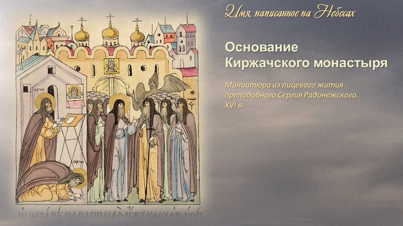 История создания Киржачского монастыря такова. Однажды Сергий случайно услышал слова родного брата Стефана, который к тому времени вернулся в Радонежский монастырь, о том, что игуменом этой обители должен быть он, Стефан, потому что поселился здесь первым. Преподобный в тот же день незаметно от всех ушёл из Радонежа.
