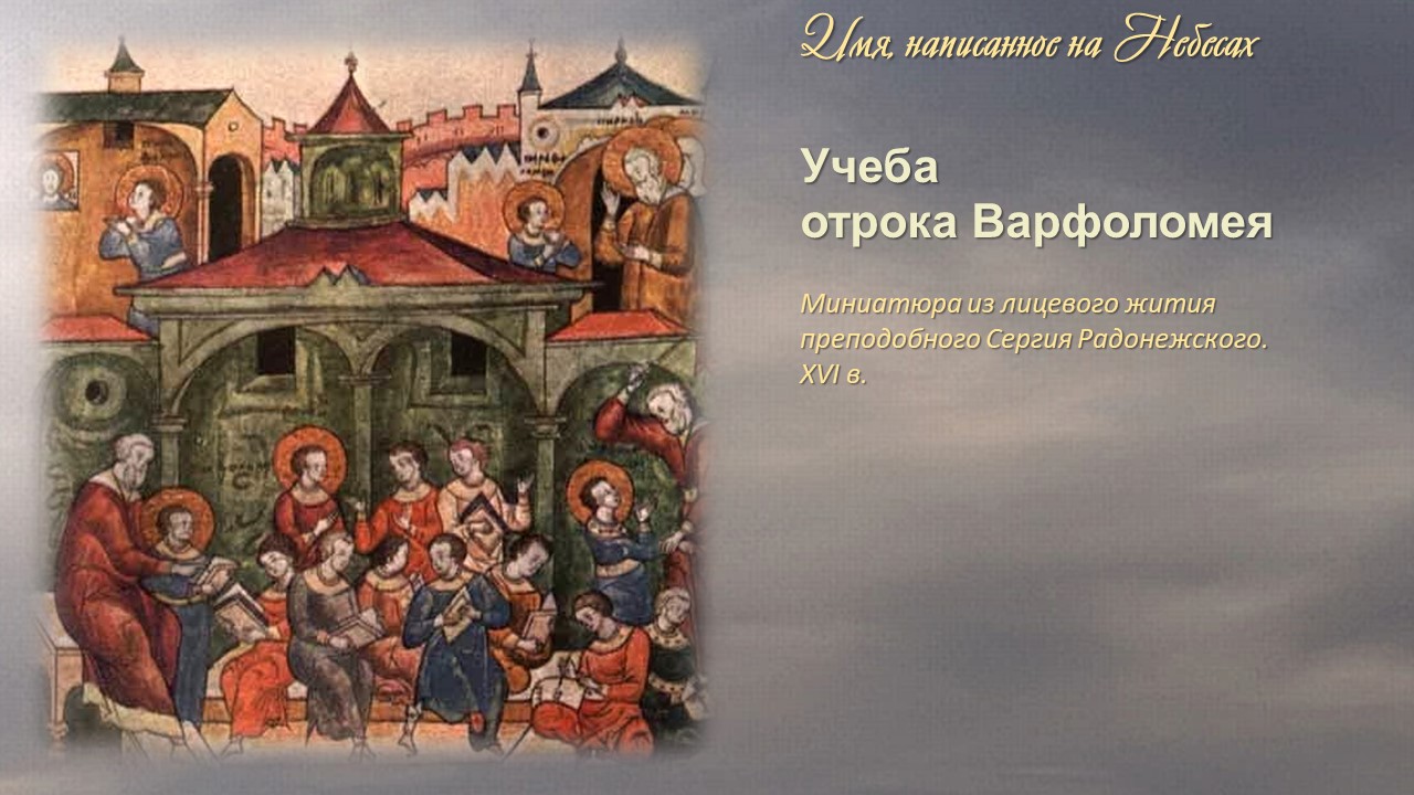 В семилетнем возрасте Варфоломея отдали для обучения грамоте. Старший брат Стефан и младший — Пётр учились успешно, а Варфоломею учёба не давалась. Родители его сильно ругали, учитель наказывал, а друзья укоряли. Отрок же часто со слезами обращался к Богу и просил дать знание грамоты. «Было же это по промыслу Божию, — отмечает Епифаний, — чтобы он научился книгам от Бога, а не от людей, что и случилось.