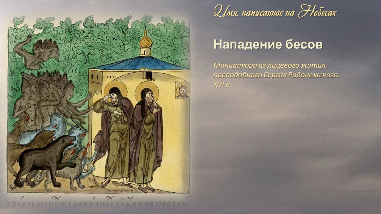 Епифаний описывает два случая нападения сил бесовских на Сергия, когда они были видимы. Первый раз дьявол с бесовским полчищем в литовских одеждах и островерхих шапках вторгся в церковь ночью перед утреней. Они запугивали его такими словами: «Беги и уходи отсюда и больше не живи здесь, на этом месте! Потому что не мы напали на тебя, но ты напал на нас. Если не убежишь отсюда, то растерзаем тебя, и умрёшь в наших руках, и не останешься в живых».