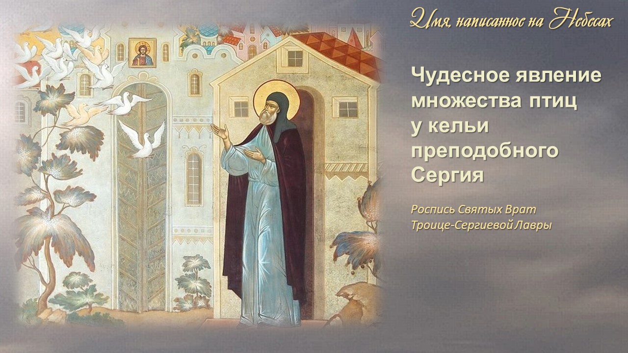 Однажды поздним вечером во время молитвы Святого кто-то позвал: «Сергий!». Он удивился столь позднему зову и посмотрел в окно кельи — во дворе всё было озарено ярким светом. Тот же голос сказал: «Сергий! Ты молишься о своих чадах, и Господь принял твоё моление. Смотри же внимательно: вот множество иноков, собравшихся во имя Святой Живоначальной Троицы. Это стадо, тобой наставляемое». Преподобный посмотрел и увидел много прекрасных птиц, которые слетелись не только в монастырь, но и в его окрестности. Голос продолжал: «Таким же многочисленным, как эти птицы, которых ты видел, будет стадо твоих учеников и после тебя не уменьшится, если они захотят следовать твоим стопам». Сергий позвал Симона, чтобы сделать его соучастником и свидетелем этого дивного явления, «и оба вместе радовались душой, трепеща от неизреченного видения».