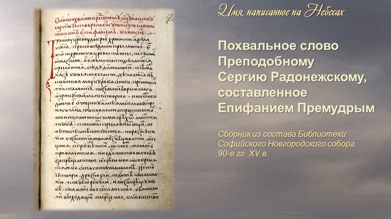 Благодаря ученику Преподобного Сергия Радонежского Епифанию Премудрому мы имеем возможность прикоснуться к жизни Светоча Земли Русской — Святого Сергия, её Заступника и «Печальника», на протяжении веков и ныне стоящего в бессменном Великом Дозоре на страже любимой Им Родины. Несомненно, что шесть столетий, прошедшие со времени написания Епифанием Жития, внесли свои коррективы в текст, но дух того времени и Образ самого Святого, с благоговением воспетый его современником, всё же дошли до наших дней.