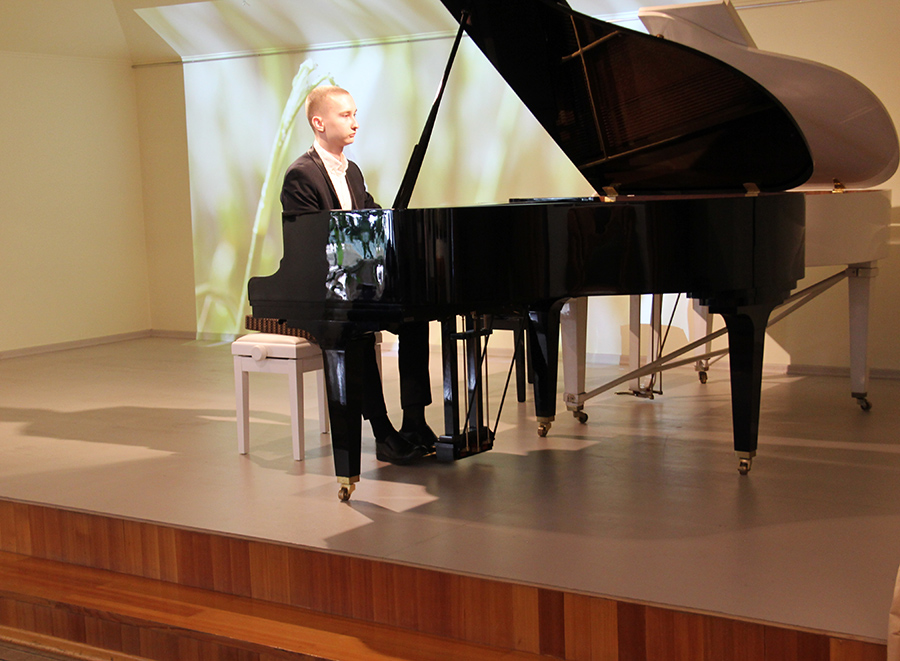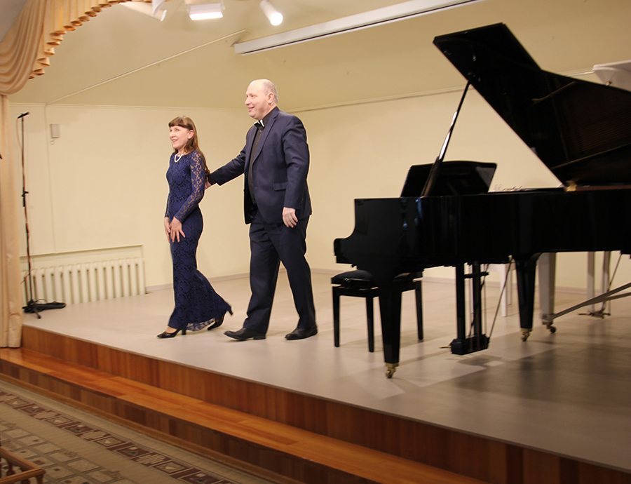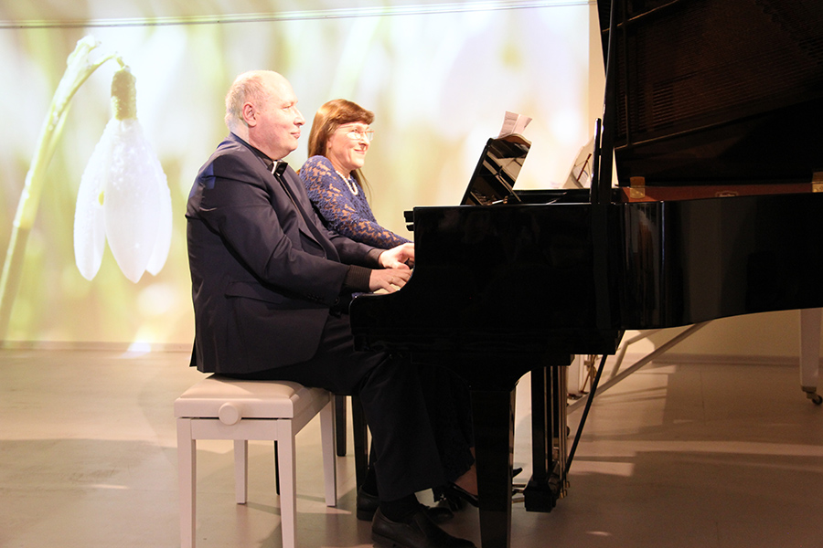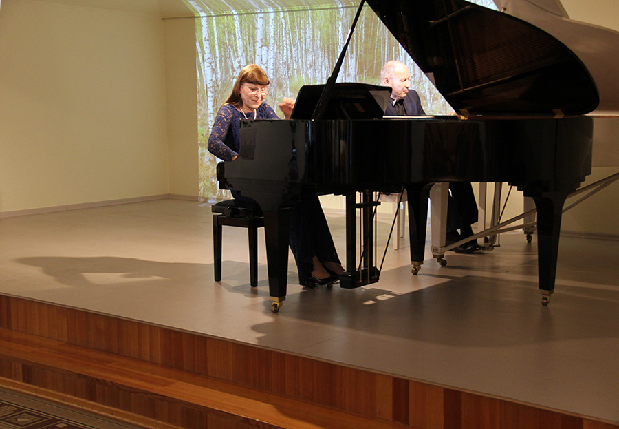 В концерте мы услышали постоянных участников музыкальных гостиных Музея Рериха — фортепианный дуэт Эльвиры и Анатолия Полонских; в их исполнении прозвучало две части из Первой сюиты С.В. Рахманинова для 2-х фортепиано.