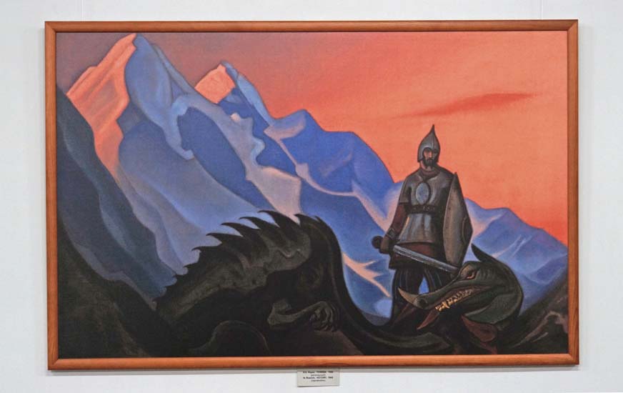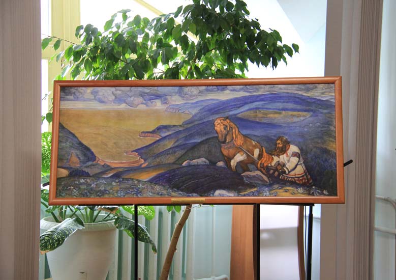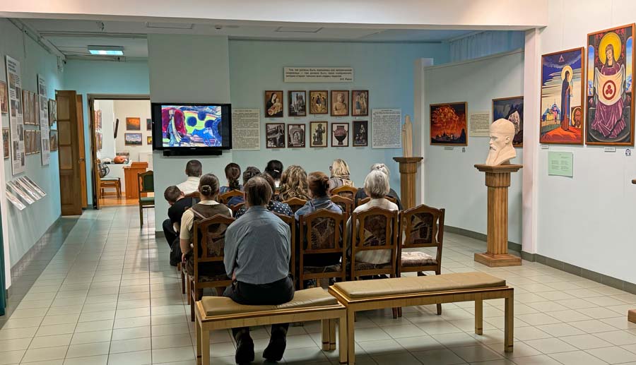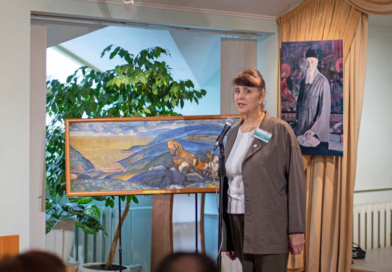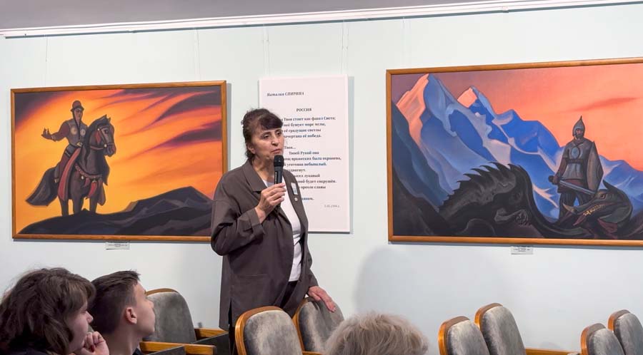 В этот день для посетителей демонстрировались видеосюжеты: «К 150-летию Н.К. Рериха» — по выступлениям Н.Д. Спириной; «Алтай – Гималаи» — о выставке в селе Верх-Уймон; «Живопись С.Н. Рериха» — по статьям художника Л.Р. Цесюлевича. Затем было проведено две тематические экскурсии. На экскурсии «Тема Родины в художественном и литературном творчестве Н.К. Рериха» посетители услышали рассказ о картинах Н.К. Рериха «Микула Селянинович», «Победа» и «Настасья Микулична».