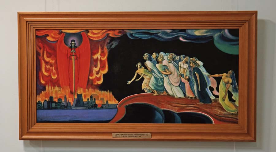 Картина «Воззри, человечество!» («Предупреждение человечеству»): «Это — последний призыв к людям, забывшим о своей божественной природе и о Высшей Помощи; это — предупреждение о катастрофах, которые неизбежны в том случае, если человечество не опомнится и не пойдёт по правильному пути» (Н.Д. Спирина).