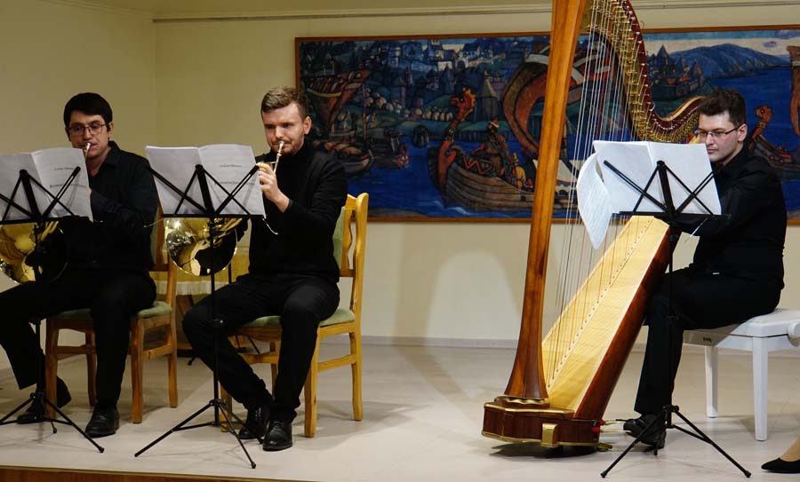 Затем состоялся концерт, в котором приняли участие артисты Новосибирского академического симфонического оркестра: доцент кафедры струнных инструментов Новосибирской консерватории имени М.И. Глинки С.А. Овчинников (виолончель); профессор НГК В.Г. Соколов (валторна); член жюри второго Сибирского арфового фестиваля имени Н.Н. Покровской Т.В. Тарновская (арфа).