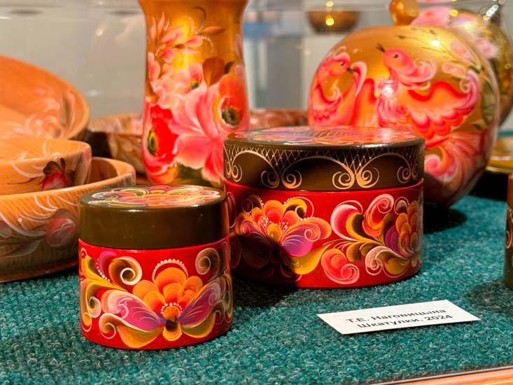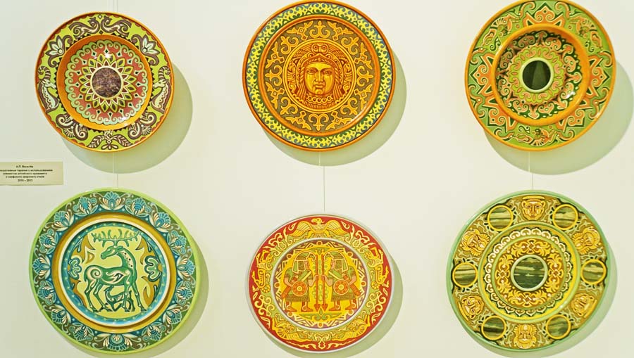 На выставке представлены его живописные работы и декоративные тарелки, украшенные росписью и инкрустированные природным камнем.