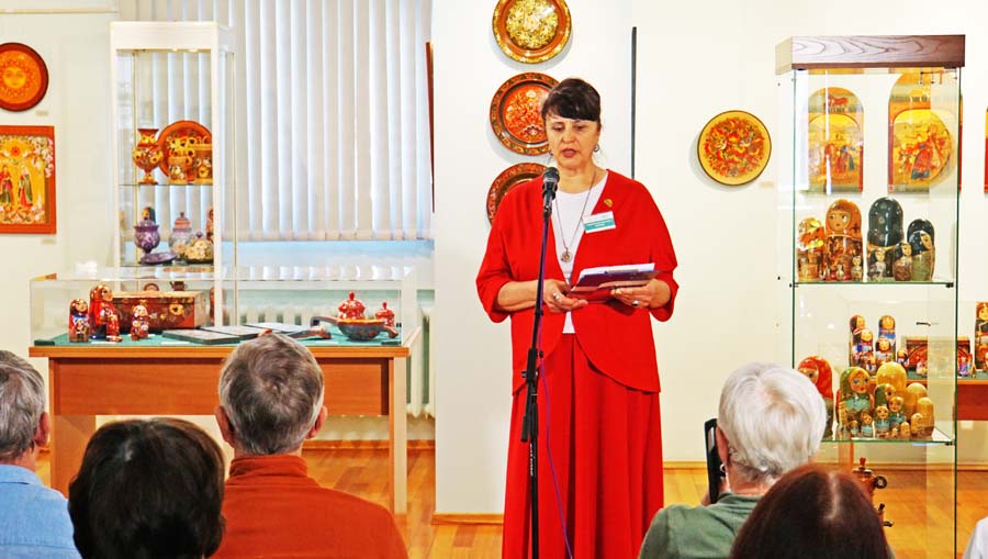 Из выступления Т.Е. Наговицыной: «Из всех искусств народное — самое древнейшее. В народном искусстве никогда не изображается агрессия. Как же найти пути к гармоничной жизни? Надо обратиться к своим корням, к своему прошлому. Нина Тимофеевна Черникова в своих матрешках освещает нашу историю, это так важно для подрастающего поколения, а также и для нас, для взрослых, чтобы не забывали. Красота природы, особенно неповторимая красота Горного Алтая, хорошо отражается в полотнах А.П. Веселёва. Очень жалею, что у меня не было при его жизни совместной выставки. Я этого художника очень уважаю. Как он любил свою природу, как он относился к ней бережно! Действительно, человек жил в единении с природой.
